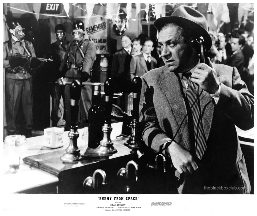 Brian Donlevy again played Professor Bernard Quatermass, who this time becomes involved with an alien invasion on a much larger scale. Now in charge of the British space project, he is trying to persuade the government to finance the development of a life-support bio-dome that would enable mankind to live on the moon. The government pleads lack of funds, so a disgruntled Quatermass returns to his rocket installation where he is informed by his assistant Marsh (Bryan Forbes) that a number of mysterious small objects have been picked up on their radar. These appear to be falling in the direction of a nearby town called Wynerton Flats. While checking the area the next day, they find several small projectile-like objects and, to Quatermass’s great amazement, they also discover an establishment that looks exactly like his own proposed bio-dome! Soon after, the projectile held by Marsh explodes, leaving a strange scar on his face. At that moment, masked soldiers emerge from the bio-dome, surround the scientists and take away Marsh.