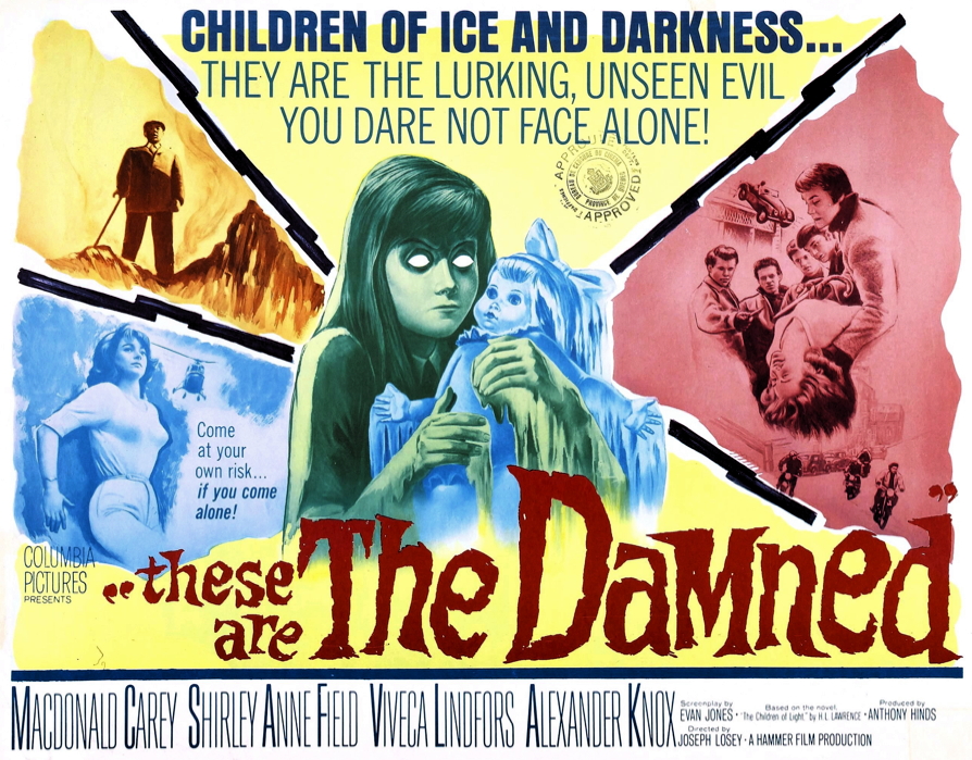 The Fly (1958) went as far as any film of the period in evoking the horror of the body in terms of disgusting metamorphosis. But changes to the body could be much more subtle, and this was the case with The Damned (1963) released in the United States as These Are The Damned, made in 1961 for Hammer Films by the celebrated director Joseph Losey, who was undergoing hard times after his exile from Hollywood as an undesirable Communist sympathiser during the McCarthy period. Apart from concerning an unusual group of children, this film has absolutely nothing to do with John Wyndham‘s novel, though there’s no doubt it was inspired by the success of Village Of The Damned (1960). The Damned, based on the novel The Children Of Light by H.L. Lawrence and scripted by Evan Jones, can be rather pretentious at times.
