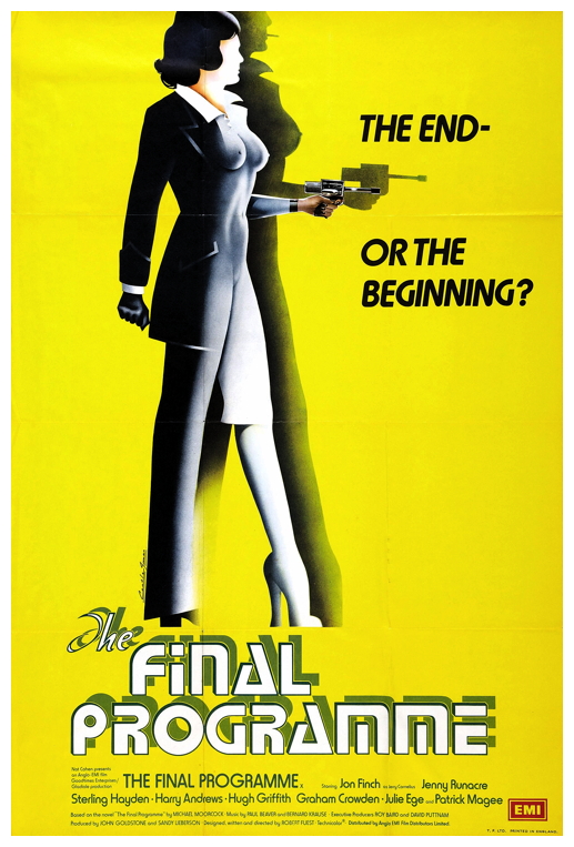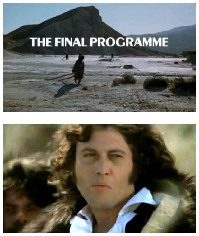 There were also films still being made that visually and stylistically belonged to the previous decade, one of these being the less-than-satisfactory adaptation of The Final Programme (1973) released in the United States as The Last Days Of Man On Earth, presumably because American distributors didn’t want to deal with the English spelling of the word ‘Programme’. It was written and directed by Robert Fuest, a former set designer who had gone from directing colour episodes of The Avengers television series, to The Abominable Doctor Phibes (1971) and Doctor Phibes Rises Again (1972). It wasn’t until he made The Devil’s Rain (1975) that he had really caught up with the seventies, and by that time it was too little too late. The Final Programme was based on the novel by Michael Moorc**k, one of Britain’s most innovative science fiction writers (although Moorc**k prefers to call it Speculative Fiction) and features one of Moorc**k’s most famous creations, Jerry Cornelius, a multi-faceted, multi-purpose character who embodies many of the prevalent myths of the 20th century: He’s rich, he’s a rock star, a mercenary, a mystic, a scientist, a secret agent, a Christ figure and many other things beside.