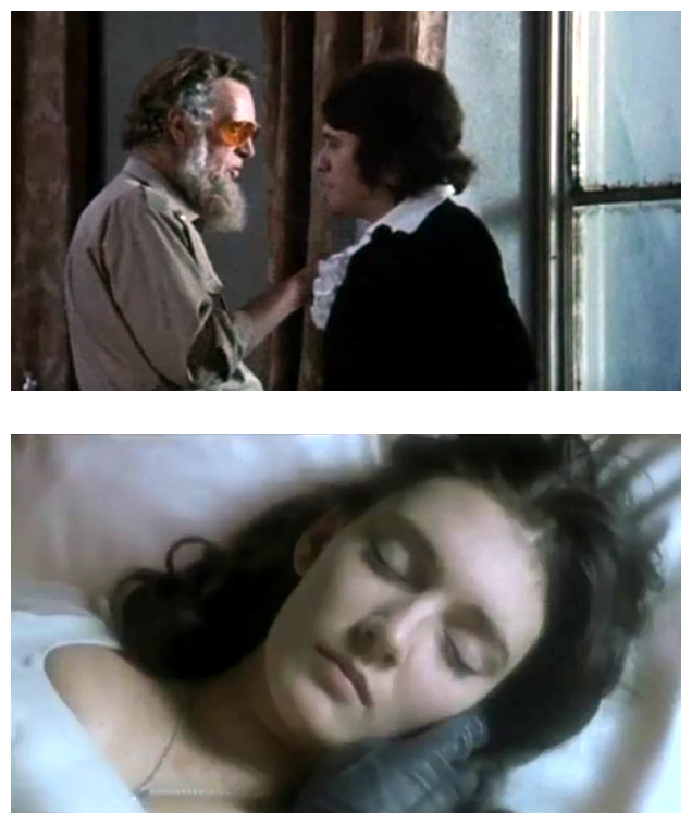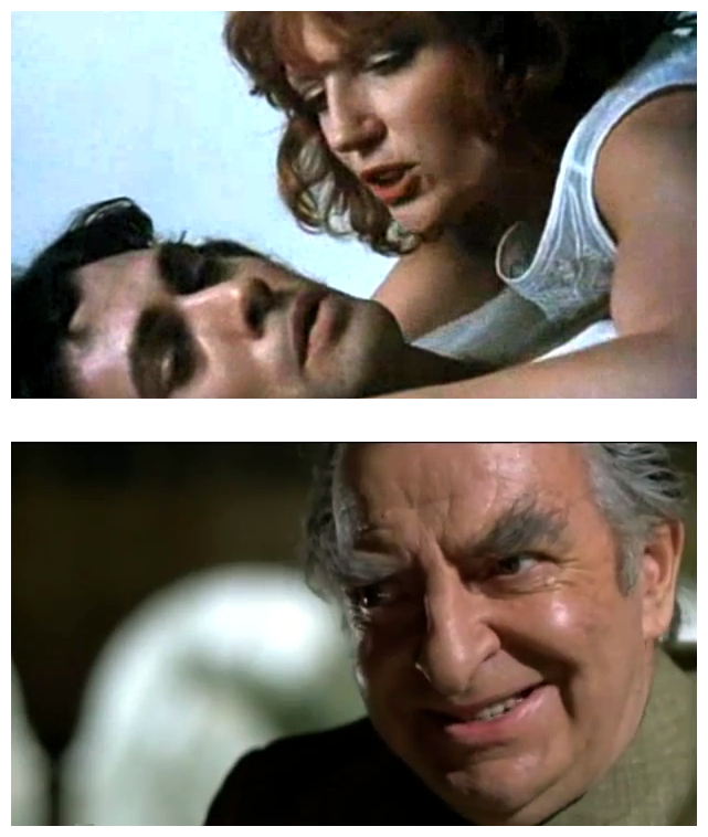 Jon Finch fits the part of Jerry visually but fails to reproduce the infinitely ambiguous character of the novels. It could have been worse – Finch replaced Timothy Dalton at the last minute. More successful is Jenny Runacre as Miss Brunner, who comes on like a force ten hurricane, tossing men around like rag dolls and absorbing her lovers, both male and female, with casual ease. Least impressive is Derrick O’Connor as Frank Cornelius, who lacks the necessary rat-like presence, and an impressive lineup of experienced character actors goes to waste: Sterling Hayden, Harry Andrews, Hugh Griffith, Patrick Magee, Sarah Douglas, Graham Crowden, George Coulouris, Ronald Lacey, Sandra Dickinson.