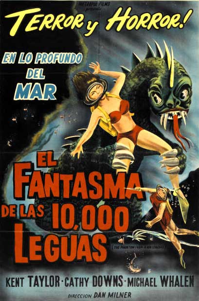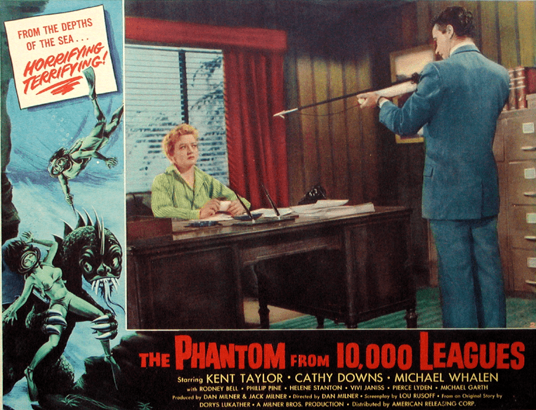 Firstly, I’d like to point something out. For the record, the figure in the title of Jules Verne’s 20,000 Leagues Under The Sea refers to the linear distance covered by the Nautilus from the time Captain Nemo takes Ned Land, Aronnax, and Conseil aboard to the time of the submarine’s apparent destruction, and not to the depth at which the Nautilus cruises. In fact, no submarine could cruise at such a depth, at least not on this planet. A league is a rather imprecise unit, defined variously as anything from roughly 2.4 to 4.6 miles, but even the most conservative definition yields a value for 20,000 leagues that is an order of magnitude greater than the total diameter of the Earth. I bring this up because of people like the makers of The Phantom From 10,000 Leagues. Not only do they proudly trumpet their ignorance of just what a league is with a title like that, but they go on to attach it to a movie in which the titular monster inhabits a kelp bed which can’t possibly be located more than about fifteen feet below the ocean’s surface.