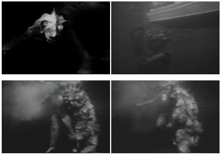 Which brings me to my second point – if we can see it, then it isn’t actually a phantom. It’s more like The Creature From The Black Lagoon‘s (1953) hillbilly cousin. Though it is portrayed by the standard man in a suit, it really can’t be characterised as a Gill Man. Vaguely Humanoid Sea Serpent might be the best description. It’s a lumpy thing, with a barrel-chested body, short, squat, flipper-like limbs, and a somewhat bovine head adorned with a row of backward-curving horns running down the mid-line from snout to cranium. All in all, it looks like the kind of thing that might turn up in an ambitious high school play of Saint George And The Dragon. This creature is among the very first things we see, too, as a fisherman in a little rowboat accidentally snags it in his net, and is pulled to his death beneath the waves. Strangely, his body will later be described as having suffered massive radiation burns rather than the sort of damage you’d expect a sea monster to inflict.