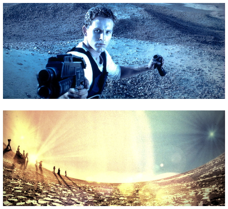 While the majority of special effects work was realised in England, the film itself was shot in Australia at Warner Brothers Roadshow studios and on location at Coober Peedy in the country’s remote southern region. Shooting in Australia gained the production access to a less costly yet thoroughly professional film crew, as well as to the usual dramatic vistas to be found in the Australian desert, a region featuring neither vegetation nor signs of human habitation that was ideal for representing the forbidding unnamed planet. In fact, that very same year Red Planet (2000) starring Val Kilmer was also being filmed in exactly the same region. Other films shot in Coober Peedy include Mad Max Beyond Thunderdome (1985), Salute Of The Jugger (1989), The Adventures Of Priscilla Queen Of The Desert (1994) and the downright embarrassing Kangaroo Jack (2003).