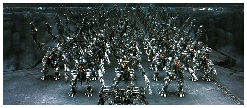 The Matrix Revolutions (2003) brought to a close a wild science fiction ride chronicling humanity’s struggle to escape a computer-generated synthesis of reality known as the matrix, and marked the culmination of a four-year endeavour initiated on the heels of the first film. Each film utilises the newly-available virtual technologies in service to its story. Whereas Reloaded had focused on a ‘Burly Brawl’ between Neo (Keanu Reeves) and Agent Smith (Hugo Weaving), and a hell-for-leather chase along a highway, Revolutions centres on an entirely virtual journey into the nexus of the machine world, a climactic ‘Super Burly Brawl’ and an enormous battle sequence that features both virtual and miniature effects. Known as the ‘Zion Siege’, the central Revolutions conflict pits humanity’s refuge against an unrelenting storm of attacks from the machine world.