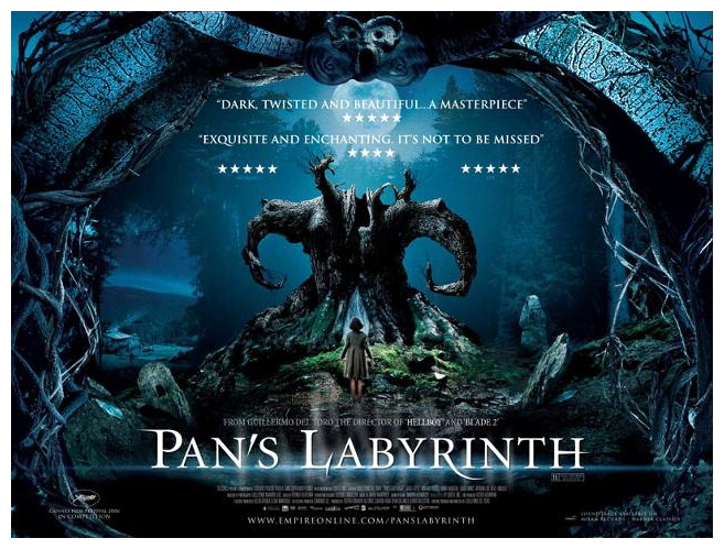 “In 1944 post-Civil War in Spain, rebels still fight in the mountains against the fascist troops. The young and imaginative Ofelia travels with her pregnant and sick mother Carmen Vidal to the country to meet and live with her stepfather, the sadistic and cruel Captain Vidal, in an old mill. During the night, Ofelia meets a fairy and together they go to a pit in the center of a maze where they meet a faun that tells that she is a princess from a kingdom in the underground. He also tells that her father is waiting for her, but she needs to accomplish three gruesome, tough and dangerous assignments first. Meanwhile, she becomes friend of the servant Mercedes, who is the sister of one of the rebels and actually is giving support to the group. In a dark, harsh and violent world, Ofelia lives her magical world trying to survive her tasks and sees her father and king again.” (courtesy IMDB)