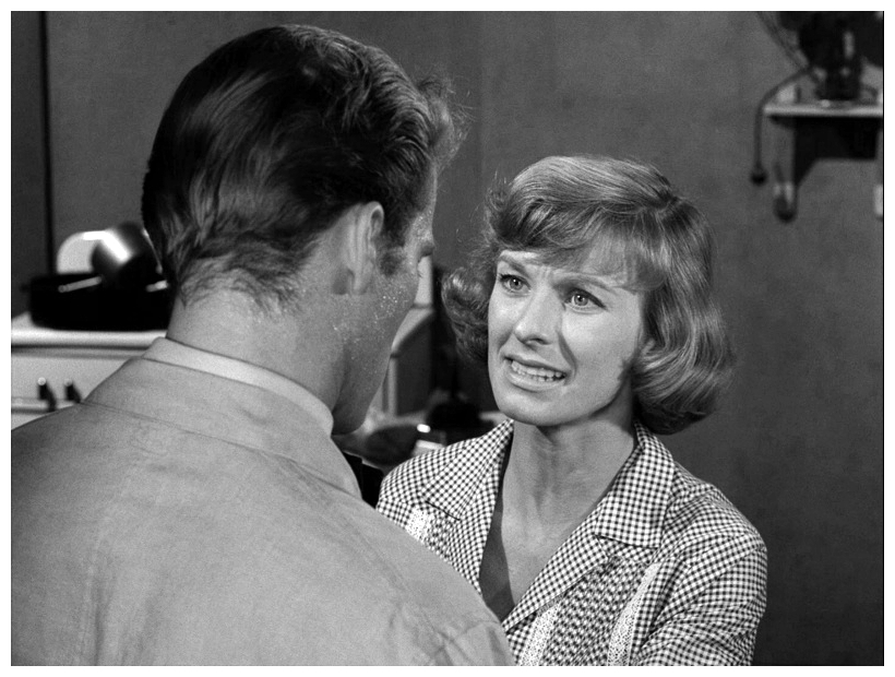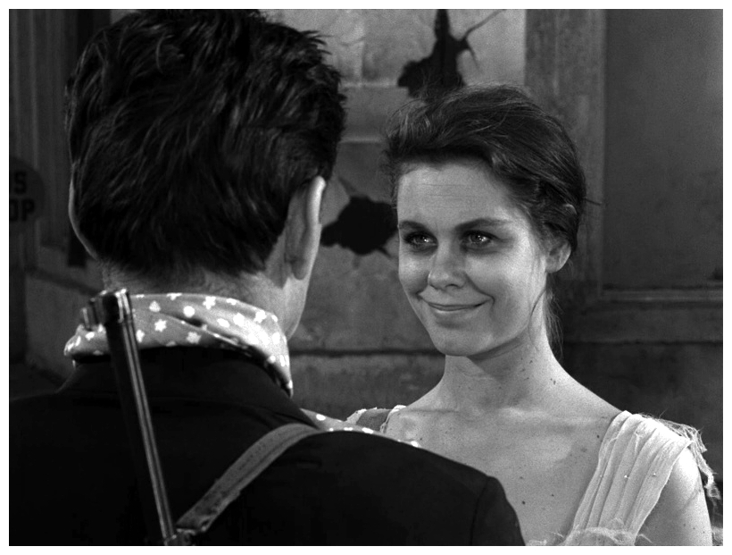 #66 TWO – The opening narration tells us the time could be the distant past or the far future. A female soldier, the survivor of an apocalyptic war, stumbles into a deserted war-ravaged town. Searching a derelict restaurant she finds a can of chicken but, before she can open it, a man also wearing a military uniform walks in. Recognising the enemy uniform, she immediately attacks. After all attempts at defending himself fail, the man knocks her out and begins to eat the chicken while the woman lies unconscious on the floor. He examines a calendar with a woman in a swimsuit on the wall, turns to look back at his opponent and realises that his desire for human companionship is stronger than his desire to continue a pointless war. Written & directed by Montgomery Pittman starring Elizabeth Montgomery & Charles Bronson. This episode was actually filmed on the backlot of Hal Roach Studios, which was literally falling apart due to mismanagement and disuse, and was finally torn down soon after.