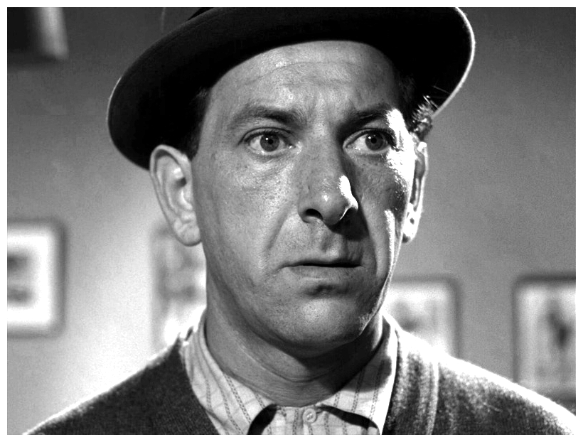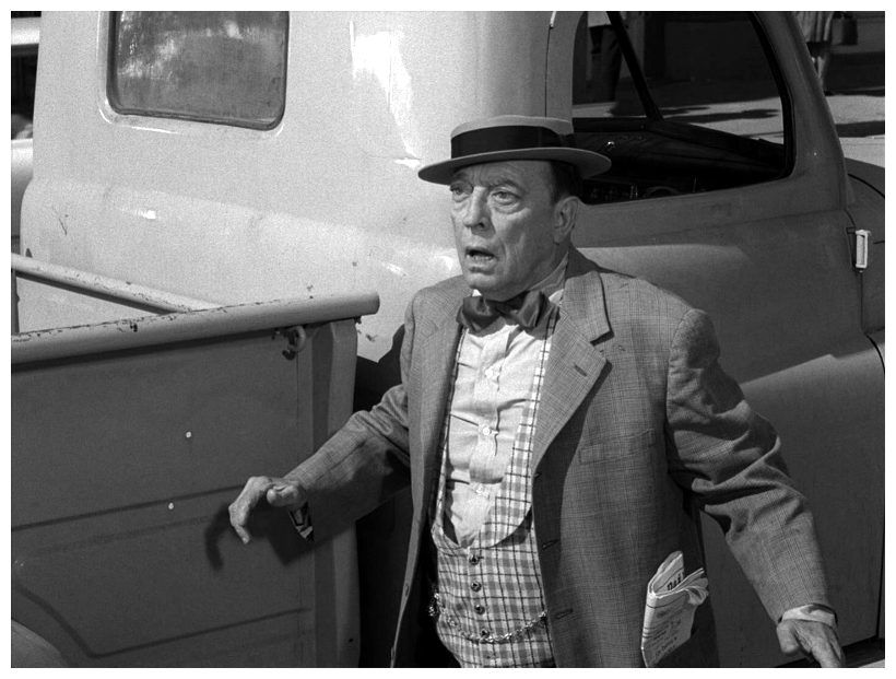 #78 ONCE UPON A TIME – Janitor Woodrow Mulligan gets a trip from 1890 to 1962 courtesy of his employer’s time helmet. Directed by Norman Z. McLeod from a script by Richard Matheson starring Buster Keaton & Stanley Adams. This episode was one of several Twilight Zone comedies. The scenes set in 1890 are silent with honky-tonk piano and title-cards (except for Serling’s voiceover). Mulligan shows up in 1962 without his trousers due to being run over by a bicycle, and there’s a running gag that has Mulligan chased by a policeman in both eras. Keaton was one of America’s greatest filmmakers and one of the biggest stars of the silent era, devising elaborate stunts and gags for such classic comedies as The General (1926) and Steamboat Bill Junior (1928). Unfortunately his career suffered with the introduction of sound films and spent many decades struggling to find work in Hollywood. This episode is intended as an homage.