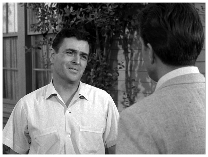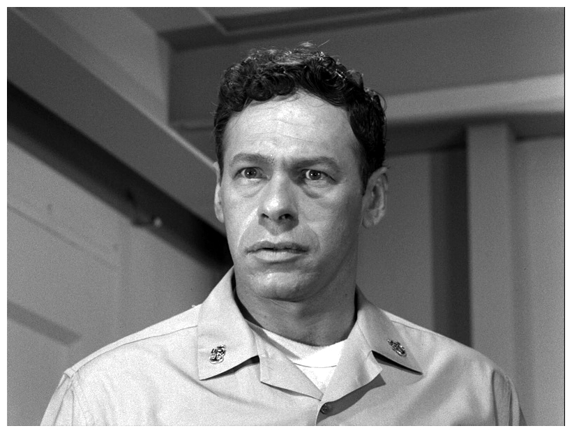 #104 THE THIRTY-FATHOM GRAVE – In the early sixties, as a US Navy ship cruises near Guadalcanal in the South Pacific, its sonar detects muted hammering on metal undersea. The eerie sounds emanate from a submarine on the ocean floor, maybe there since World War TwoI. A very nervous crew member on the ship served aboard that submarine and was its sole survivor. Directed by Perry Lafferty from a script by Rod Serling starring Simon Oakland & Mike Kellin. Although the producers did their best to manage the minuscule budget afforded by CBS, some continuity errors would nevertheless occur. In this particular case, the ship’s hull number in the opening exterior shot is different from the one shown immediately thereafter. The opening shot is of the USS Mullinnix but, in the very next shot, the number on the life preserver designates the ship as the USS Edson. At least both ships were Forrest Sherman-class destroyers. While the episode is mostly accurate in terms of military customs and courtesies, one scene depicts a diver saluting his captain uncovered. This confuses Army tradition with Naval tradition, where saluting is only appropriate when covered and upon meeting. The doctor of the ship is also depicted as a Navy Chief, but enlisted sailors only qualify for the Corpsman rating.