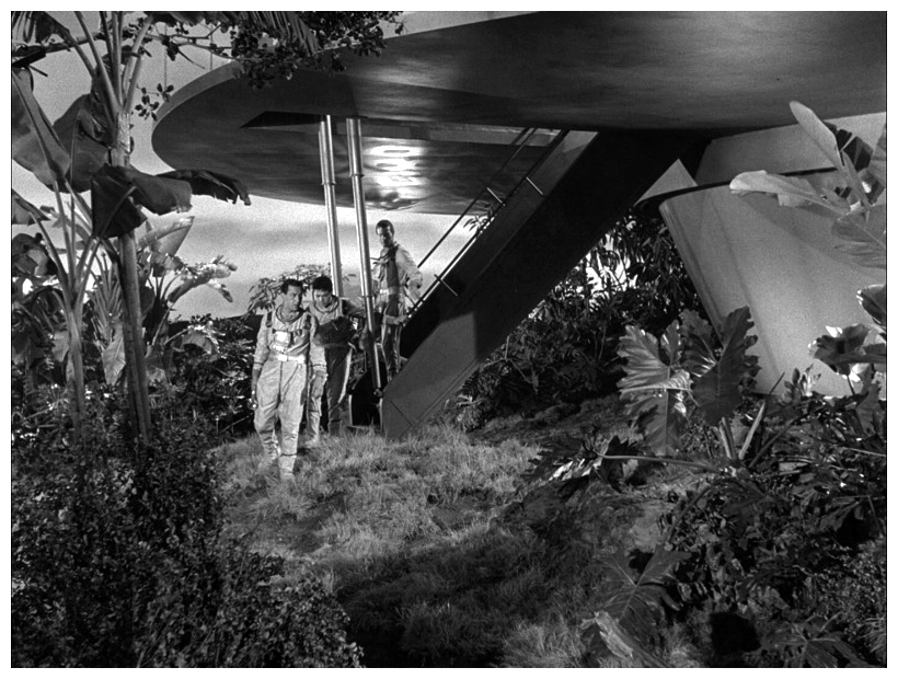 #108 DEATH SHIP – An interplanetary expedition of three American astronauts – Captain Ross and lieutenants Mason and Carter – finds an exact duplicate of their ship and themselves crashed on the planet they were surveying. Should they stay or take-off and risk crashing? The men take their ship back into orbit without a hitch. Mason and Carter are relieved but stunned when Ross says they are going to land the ship again to gather samples to bring back to Earth. After all, now that they know what is going on, what is there left to fear? They land again only to discover the wreck of their ship is still there. Confused and fearful, Mason and Carter come to the one and only conclusion left: they have crashed and they are dead. Ross refuses to accept the truth, his stubborn will holding sway over the troubled crew. Ross exclaims that they will go over it again and again until he figures it out. Suddenly, the episode cuts back the beginning with Mason’s discovery of a glinting object on the surface of the planet. Directed by Don Medford from a script by Richard Matheson starring Jack Klugman & Ross Martin. The model of space-cruiser C-57-D from Forbidden Planet (1956) is pulled out of storage yet again for this episode, and the crashed ship was actually a rather realistically painted set-piece.