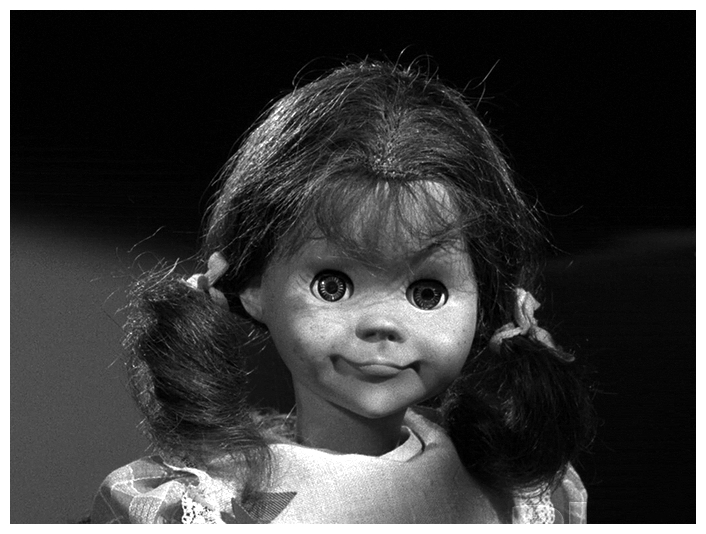 #126 LIVING DOLL – A frustrated father does battle with his stepdaughter’s talking doll, whose vocabulary includes such phrases as “I hate you” and “I’m going to kill you.” Directed by Richard C. Sarafian from a script by Charles Beaumont starring Telly Savalas & Mary LaRoche. The creepy score composed by Bernard Herrmann consists of a solo bass clarinet, backed by harps and a celesta. The doll used as Talky Tina was a non-talking doll named Brikette made by the Vogue doll company, but the real inspiration behind Talkie Tina was Chatty Cathy, a talking doll manufactured by Mattel, and actress June Foray supplied the voice of both. Foray is famous for voicing Rocky The Flying Squirrel in The Rocky And Bullwinkle Show, and most of the female characters in the Looney Tunes cartoons. In 2012 she received her first Emmy nomination, winning Outstanding Performer In An Animated Program for her role as Mrs. Cauldron in The Garfield Show. At ninety-four years old, she is the oldest entertainer to be nominated for (and winning) an Emmy Award.
