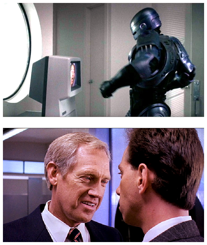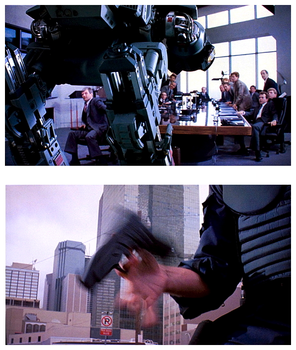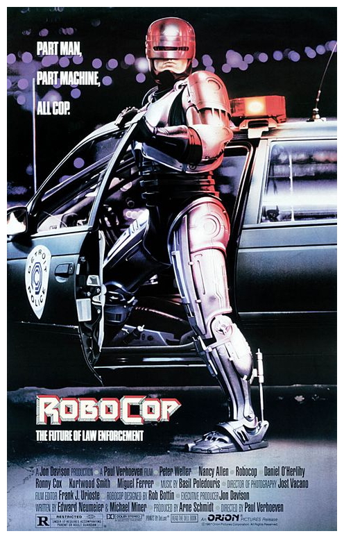 “After Omni Consumer Products announces that it bought out the Detroit police department, the department decides to go on strike. Alex Murphy gets transferred from Metro South to the West. He and his partner, Anne Lewis, track down a group of criminals led by Clarence Boddicker. Unfortunately, Murphy was killed by Clarence’s gang. Bob Morton, one of OCP’s employees, transforms Murphy’s corpse into RoboCop, to compete with another employee Dick Jones’ ED-209. RoboCop’s tests are successful. Unfortunately, RoboCop rediscovers his memories (when he was Alex Murphy), and now knows he has to find and arrest Clarence Boddicker. He realizes that Clarence is working for Bob Morton’s competition Dick Jones. Now, RoboCop must stop both Clarence and Dick Jones. (courtesy IMDB)