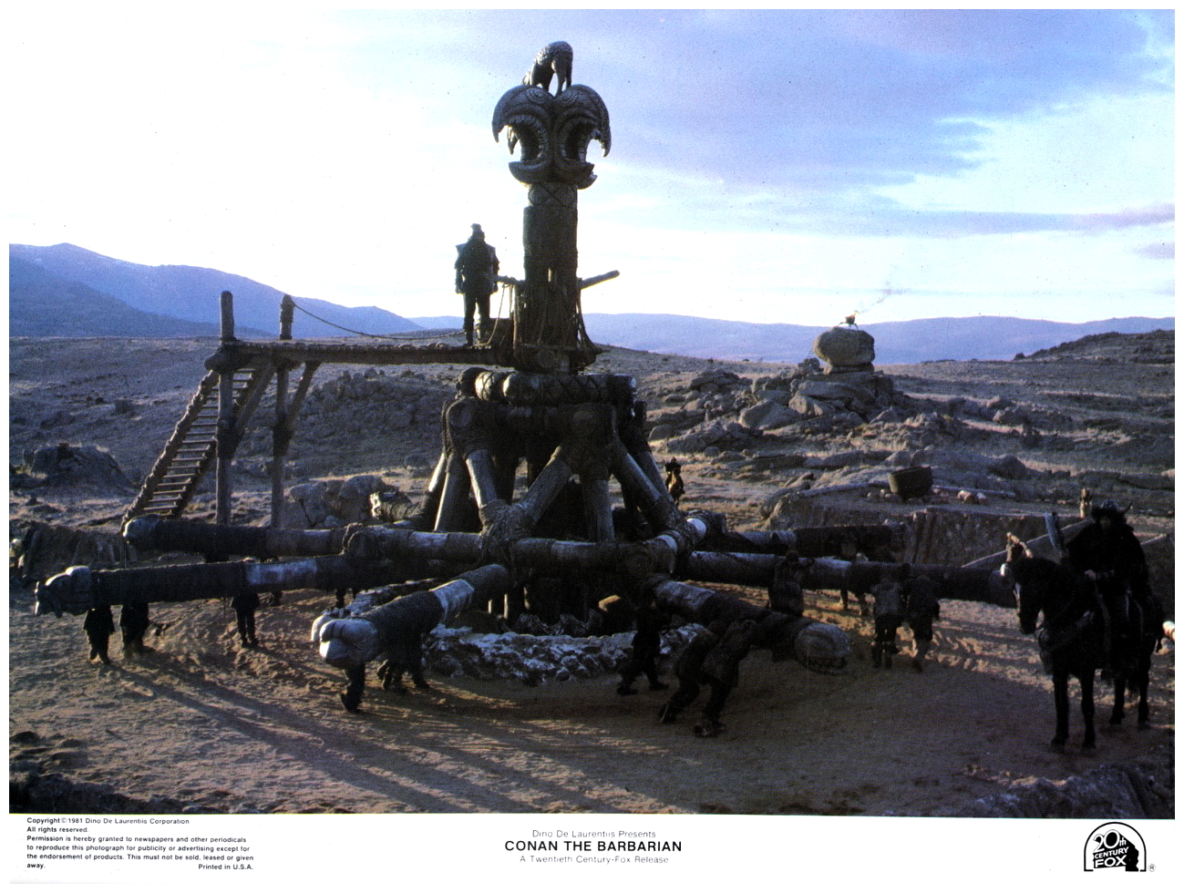 There’s an exhaustive documentary entitled Unchained produced by Laurent Bouzereau, fifty-three minutes packed with anecdotes from Milius, Schwarzenegger, Bergman, Lopez, Cobb, producer Ed Pressman, co-writer Oliver Stone, and stunt coordinator Terry Leonard. There’s also deleted scenes, most notably Milius’s cameo and King Osric’s death scene, which goes on so long it rivals Peter Sellers‘ prolonged death scene from the opening of The Party (1968). The best deleted scene features Conan being chased and eventually caught by the wolves – he’s dragged down from the rock kicking and screaming as the handler rushes in to pull the rabid pooches off him. There’s also conceptual artwork, character designs, production photos, special effects, publicity artwork, filmmakers notes and a couple of trailers that round-out an entirely satisfying, excellent DVD.