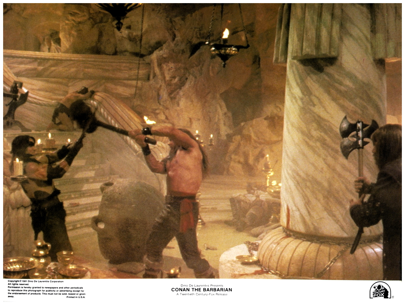 The DVD I viewed recently has an often hilarious commentary from both Milius and Schwarzenegger which makes this disc worth purchasing for their comments alone. Milius enthuses about the characters and their non-existent backgrounds while Schwarzenegger basically describes what’s on the screen with his broken English. “I was getting laid a lot here,” notes the razor-sharp Schwarzenneger during one scene. When Conan looks a little worse for wear after a serious booze binge he quips, “Ha ha, I look like an Alka Seltzer commercial!” Keep watching after the credits to see Schwarzenegger’s reaction to being hit in the head with the microphone boom.