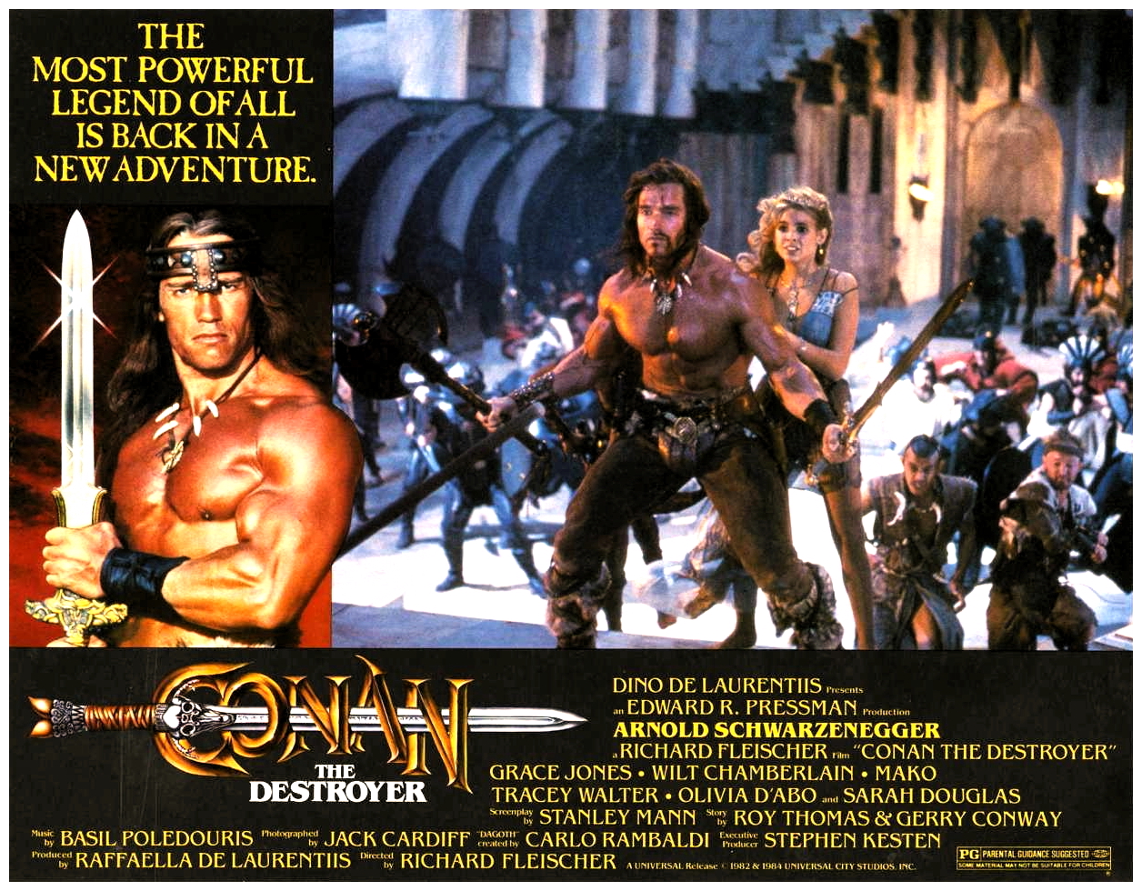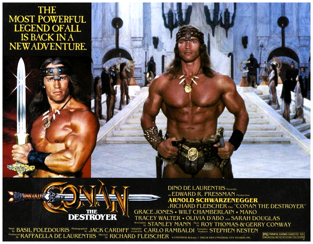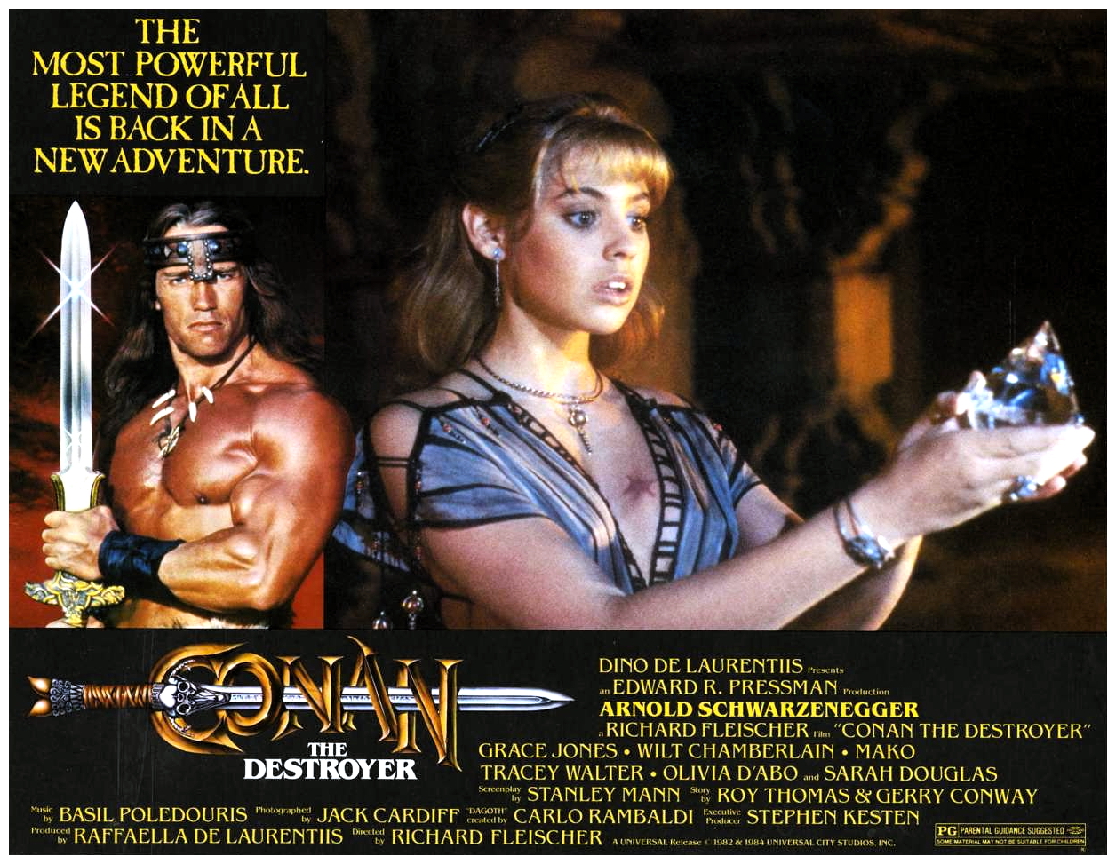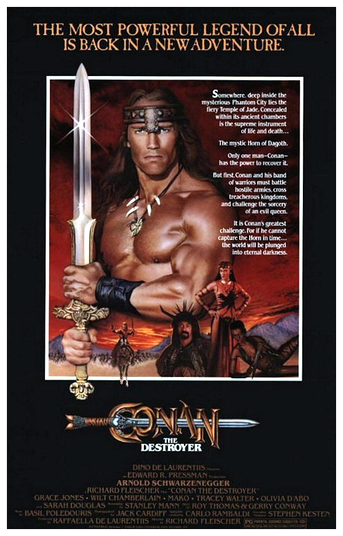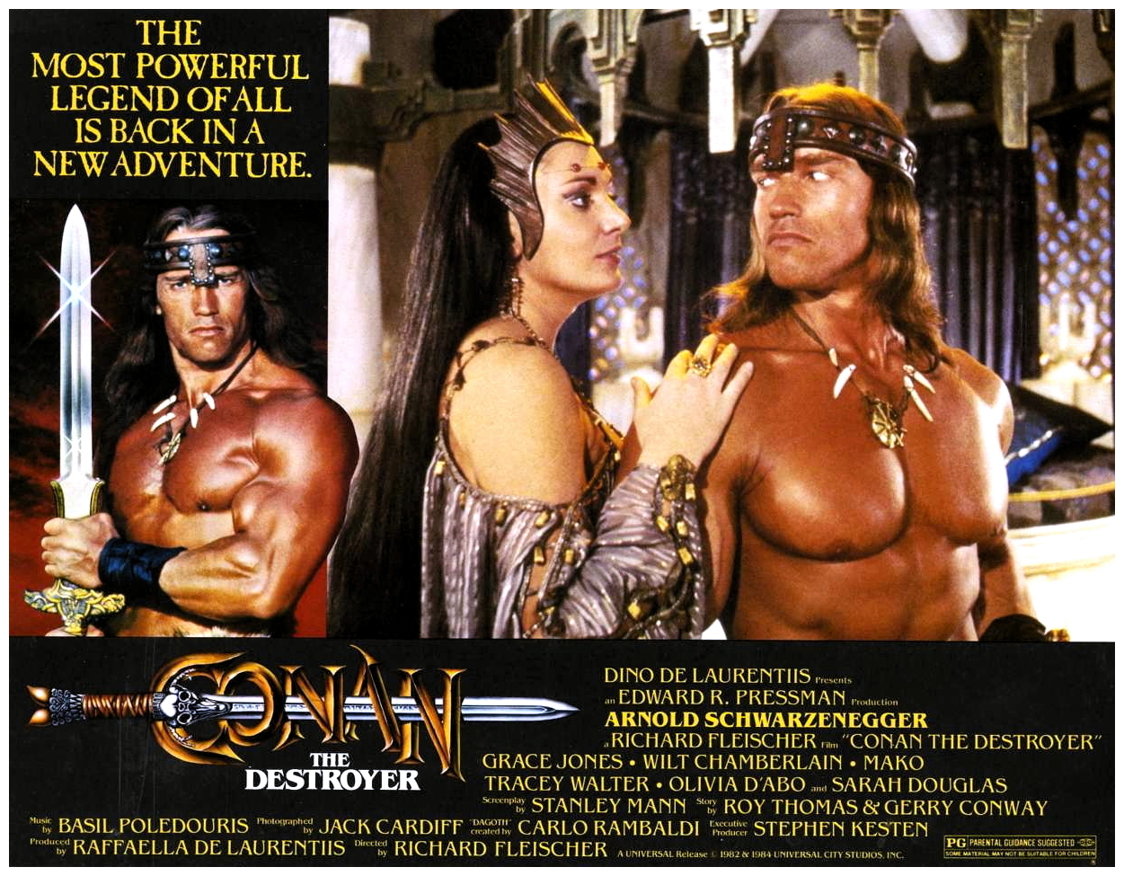 “Between the years when the oceans drank Atlantis and the rise of the sons of Arius…” enterprising producer Dino De Laurentiis commissioned this follow-up to John Milius‘s ambitious screen adaptation of Robert E. Howard‘s pulp action hero, with considerably less ambition. With Milius already having laid the groundwork, veteran director Richard Fleischer‘s economical no-nonsense sequel sends the burly sword-swinging Cimmerian Conan (Arnold Schwarzenegger) on a mission to retrieve a mysterious key for the duplicitous Queen Tamaris (Sarah Douglas), who promises to bring Conan’s beloved Valeria (Sandahl Bergman) back to life.