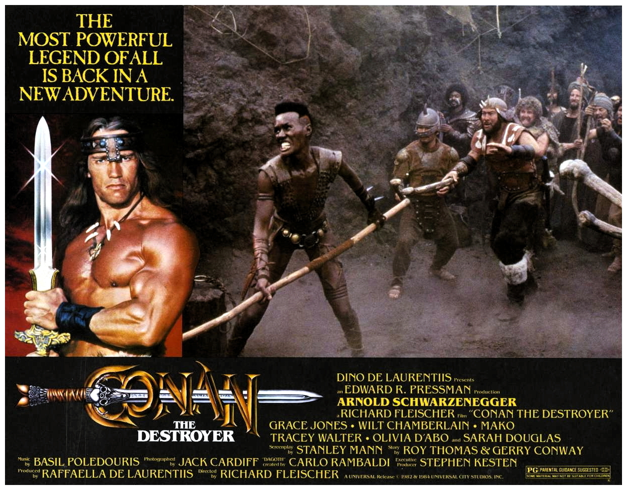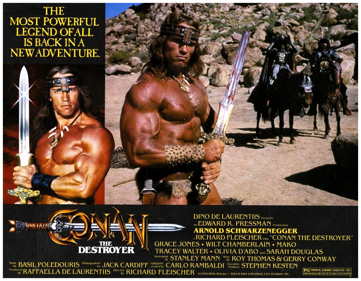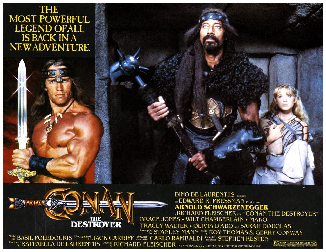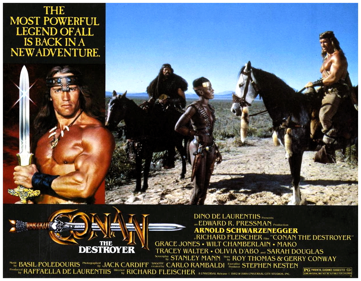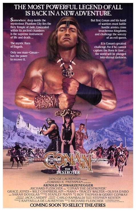 “Between the years when the oceans drank Atlantis and the rise of the sons of Arius…” enterprising producer Dino De Laurentiis commissioned this follow-up to John Milius‘s ambitious screen adaptation of Robert E. Howard‘s pulp action hero, with considerably less ambition. With Milius already having laid the groundwork, veteran director Richard Fleischer‘s economical no-nonsense sequel sends the burly sword-swinging Cimmerian Conan (Arnold Schwarzenegger) on a mission to retrieve a mysterious key for the duplicitous Queen Tamaris (Sarah Douglas), who promises to bring Conan’s beloved Valeria (Sandahl Bergman) back to life.