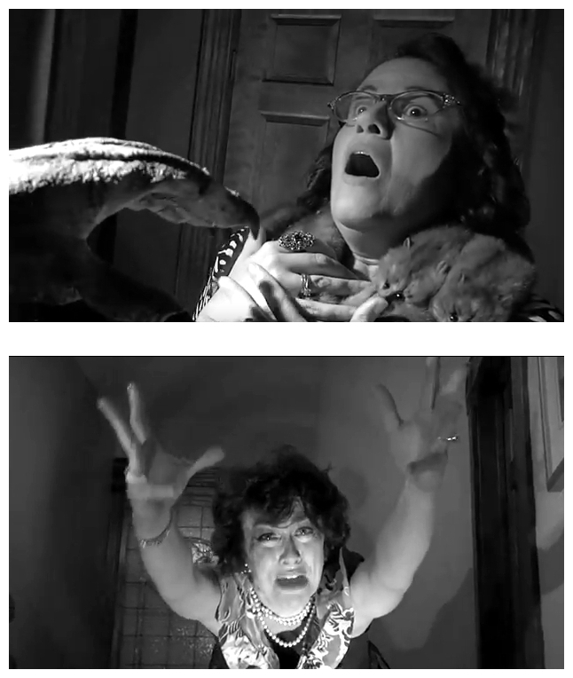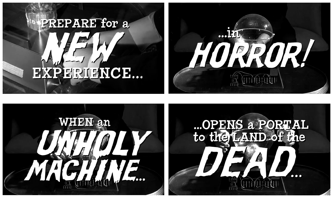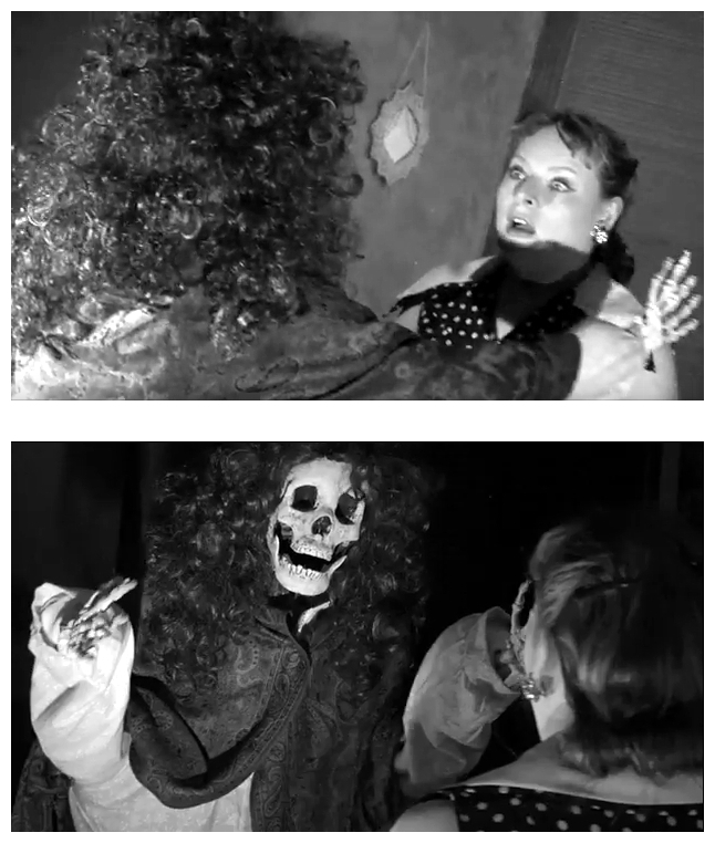 House Of Ghosts is an homage to fifties horror movie classics. Perhaps Mister Mihm should make a movie about my refrigerator – an tribute to food leftover from the fifties. In fact, it could very well be the unholy machine that opens into the land of the dead: expired broccoli; curdled potato salad; brown lettuce…someone really needs to clean that thing out – or kill it with fire. My furry old friend and furious filmmaker Christopher Mihm has temporarily left his science fiction roots to delve into the world of the supernatural and the movies of William Castle, who was also known as King Of The Gimmicks. His first film, Macabre (1958), offered a thousand-dollar life insurance policy for anyone who died of fright during the film. There were also nurses on hand to help the patrons if any of them required a happy ending, so-to-speak. Thirteen Ghosts (1960) required special 3-D glasses in order to see the ghosts, an obviously stupid gimmick that no-one would put up with nowadays.