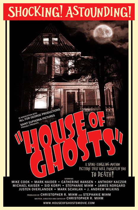 Ah, home sweet home, a haven of tranquility and security, a private cocoon, the one place you can truly feel safe, except in the nightmarish world of horror movies. Sinister darkened basements, haunted rooms, creaking doors and other unnatural otherworldly noises. Don’t fall asleep and don’t wander off, because malevolent spirits, psychotic subhumans, demonic repossessors, the ravenous undead, and homicidal poltergeists are waiting to invade, to break your bones, to tear your flesh, to feast on gore, to torture your troubled soul, and to generally be a bit of a nuisance. This week’s nostalgic knee-knocking nuisance is the instant classic House Of Ghosts (2012), Christopher Mihm‘s seventh movie but it’s his first supernatural thriller and right from the start he warns that, “It will literally frighten you to death.” This is not strictly true – as you can see, it had no effect on me whatsoever.