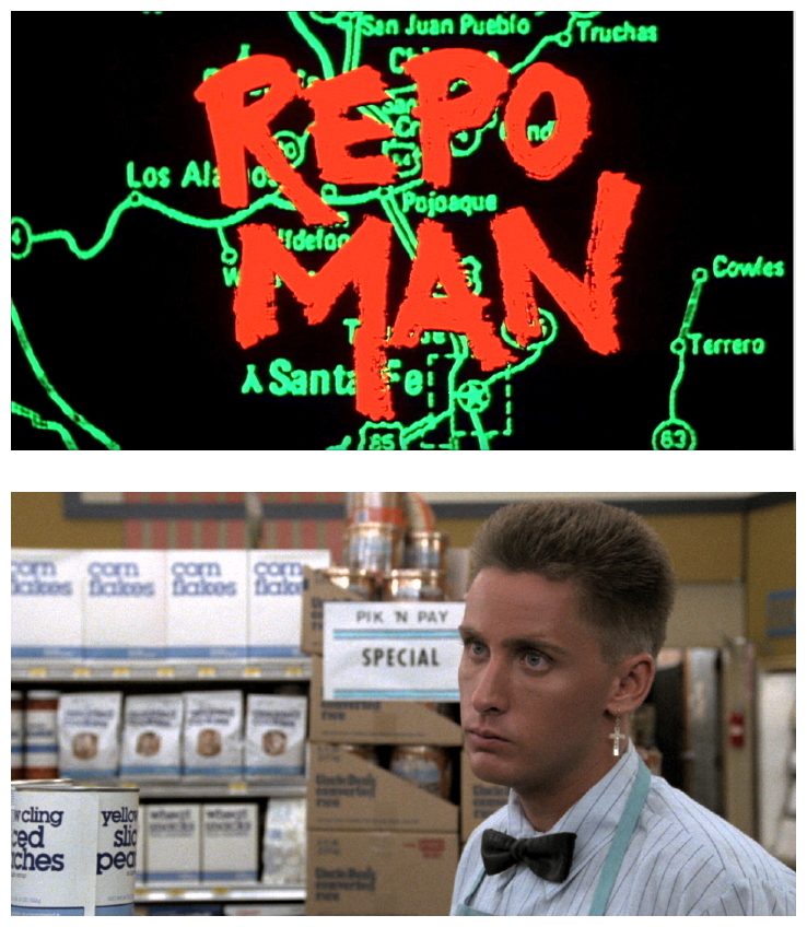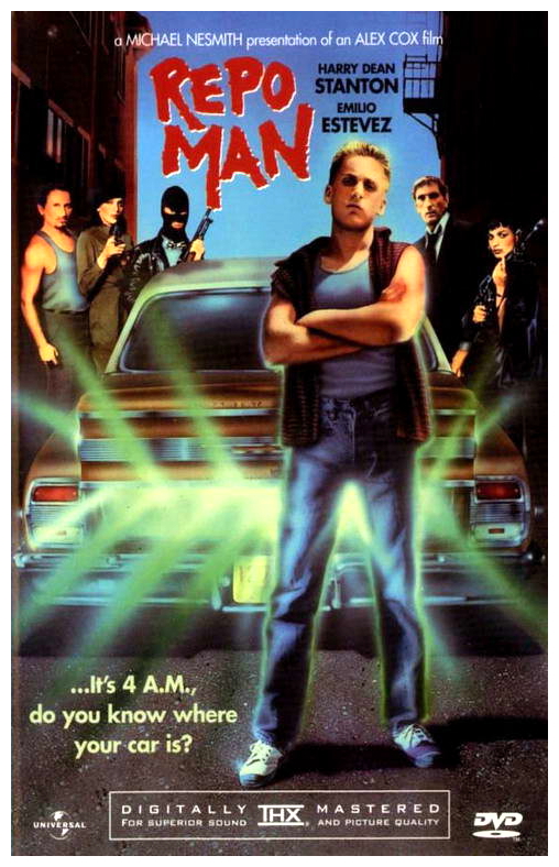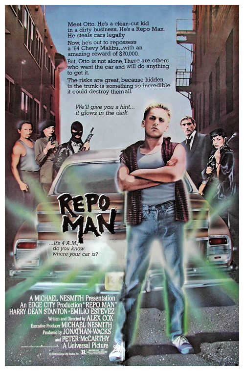 “Frustrated punk rocker Otto quits his supermarket job after slugging a co-worker, and is later dumped by his girlfriend at a party. Wandering the streets in frustration, he is recruited in the repossession of a car by a repo agent. After discovering his parents have donated his college fund to a televangelist, he joins the repossession agency (Helping Hand Acceptance Corporation) as an apprentice ‘repo man’. During his training, he is introduced into the mercenary and paranoid world of the drivers, befriended by a UFO conspiracy theorist, confronted by rival repo agents, discovers some of his one-time friends have turned to a life of crime, is lectured to near cosmic unconsciousness by the repo agency grounds worker, and finds himself entangled in a web of intrigue concerning a huge repossession bounty on a 1964 Chevy Malibu driven by a lunatic government scientist, with top secret cargo in the trunk.” (courtesy IMDB)