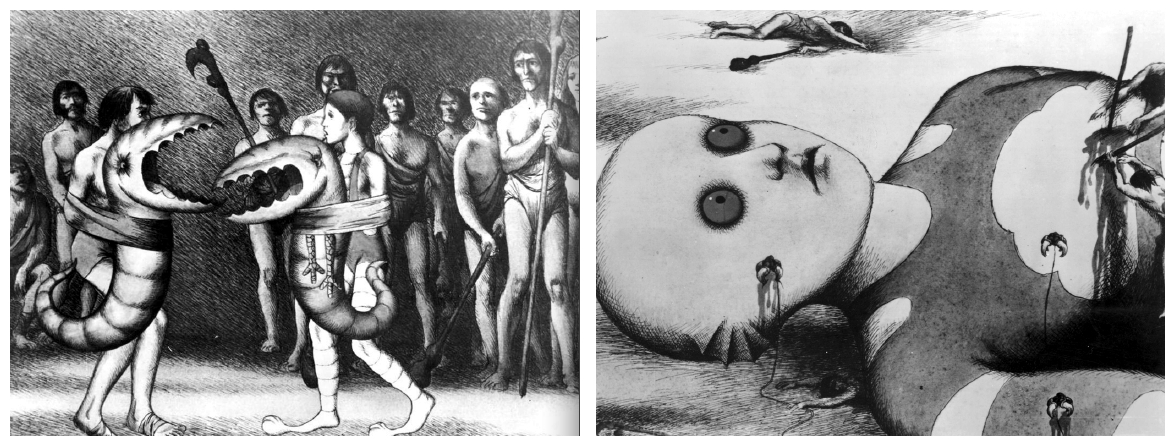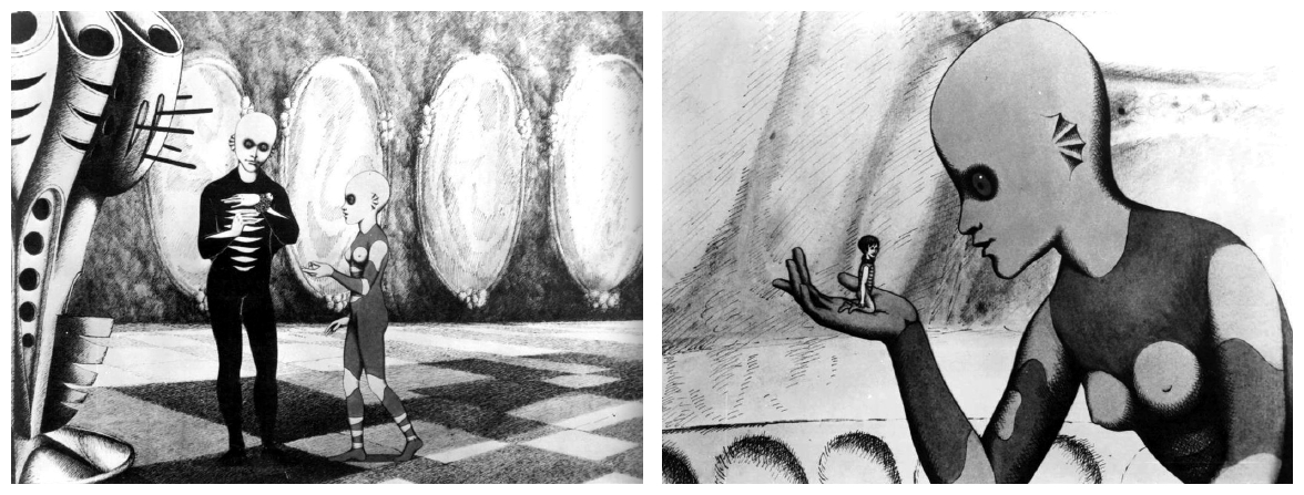 The Snails presents us with an everyday fantasy world in which a gardener growing vegetables unwittingly sets off a series of catastrophes. The film won numerous international prizes, including the Grand Prix at the Mamaïa Festival in Romania and the Special Jury Prize at the Cracow Festival. Whereas Laloux was still an unknown, Topor had already made something of a name for himself as an engraver, illustrator and screenwriter, as well as publishing novels and short stories. By the late sixties his artistic work had achieved an international reputation and his work was exhibited in London, New York and Chicago, while Laloux himself continued to paint but without much success in that particular field. Together they embarked on their first feature-length animated feature, the surreal science fiction film Fantastic Planet (La Planète Sauvage 1973).