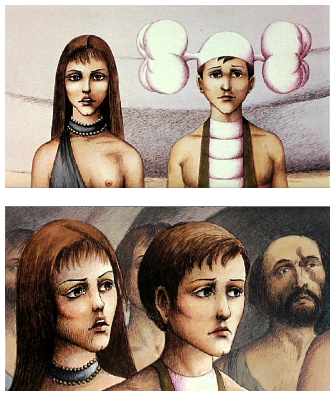 The animated landscape Laloux creates for the Draag world is surreal, bizarre, beautiful and profoundly disturbing. As Terr makes his way to the feral Oms, he encounters a variety of strange living organisms, seemingly drawn from drug-induced nightmares. The nightmare landscape strongly echoes the animation George Dunning created for Yellow Submarine (1968) in that world of Pepperland and the Blue Meanies. The opening sequence of the infant Terr watching his mother’s death and seeing her body poked by curious Draag children (as any child would a dead animal they came across) is rather disturbing. Because the Draags are the stuff of animated nightmares, we cannot identify with them, at least not in the same way we identify with the pathetic Oms and the strong verisimilitude in which they are rendered.