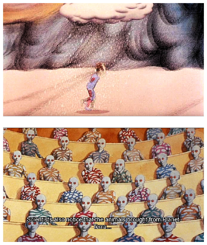 Not unlike Moses, Terr attempts to organise a mass exodus of Oms to find some kind of promised land where they can live in peace and safety, the Draags begin a program of mass extermination of all the Oms in the park they had been calling home. Evoking strong images of the Holocaust, particularly with the poison-gas mass exterminations and the collaborating Oms, wearing gas masks, running through the park on leashes searching for escaped Oms, this film really underlines that, despite being an ‘animated’ feature, not all animation is appropriate for children, especially such a profound and deeply upsetting animated classic as Fantastic Planet. Laloux and Topor adapted their story from the novel Oms En Série by Stefan Wul and, as it has a political themes, it is rather fitting that it was filmed in Jiri Trinka‘s animation studio in Prague.