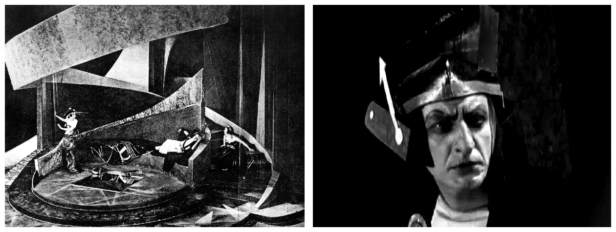 This is probably the first full-length movie to involve space travel, and is best remembered for the cubist-looking sets and costumes designed by Aleksandra Ekster and Isaak Rabinovich, whose influence can be seen in a number of later films, in particular Metropolis (1926) and the Flash Gordon serials, and plot was later loosely adapted for Flight To Mars (1951). The art design is incredibly complicated for its time: Spokes radiate from the queen’s hat, doors open like camera apertures, staircases that start in one direction and then twist back in other directions, and Aelita’s servant wears a special spiral-shaped hat that seems to radiate from her forehead and sweep around her head. This highly stylised form of design helps to suggest much more than what actually happens on the screen.