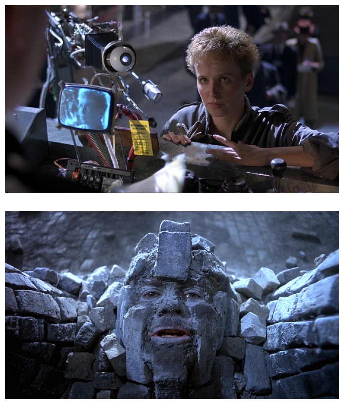 When he is arrested and about to be tortured by his former friend (Michael Palin), who should rescue him (at least in his mind) but a terrorist? Gilliam has made the bureaucracy so despicable and the general public so obnoxious that we’re actually willing to accept a terrorist as a hero. The ending is the reverse of Kurt Vonnegut‘s Slaughterhouse Five (1972) because, instead of leaving us in the brain-dead character’s happy dream world, we move away from Sam’s happy dream and back to the real world for the sorry sight of the true Sam. The final image gives logic to his ‘dream sequences’ and it should also be noted that the film’s controversial ending is much happier than Nineteen Eighty-Four’s because, in this case, a totalitarian regime cannot control a person’s dreams.