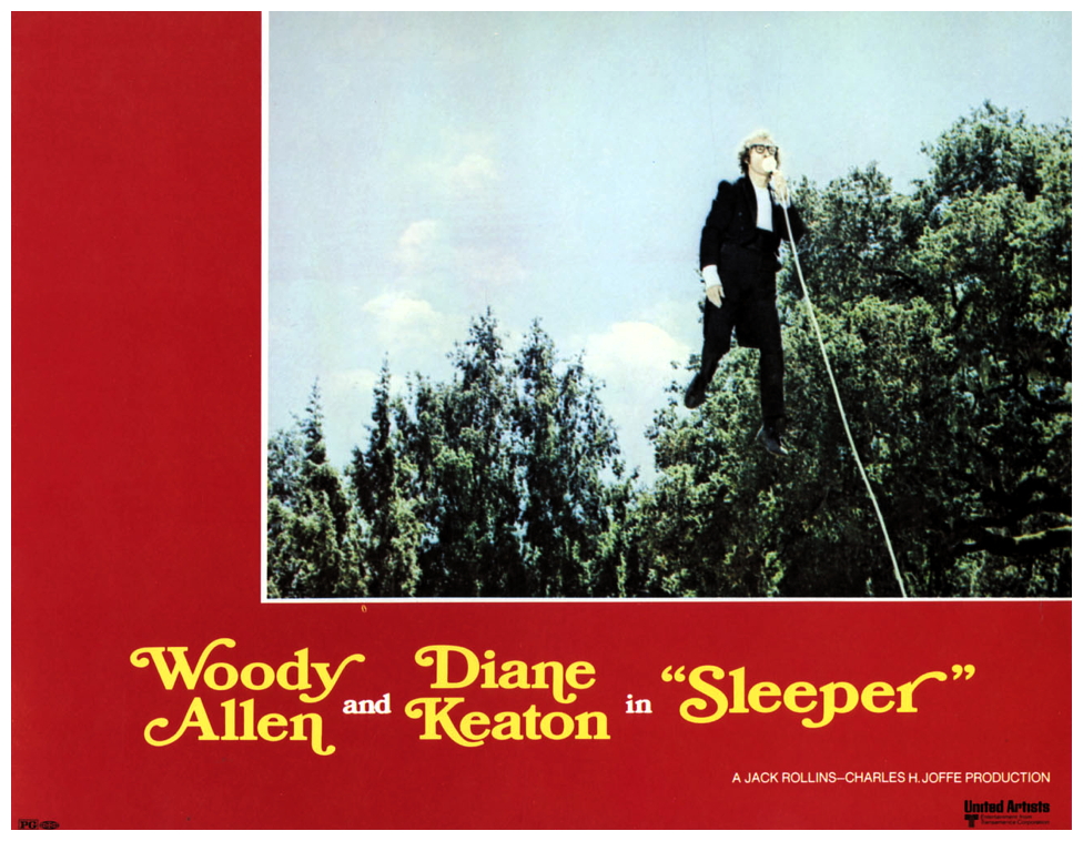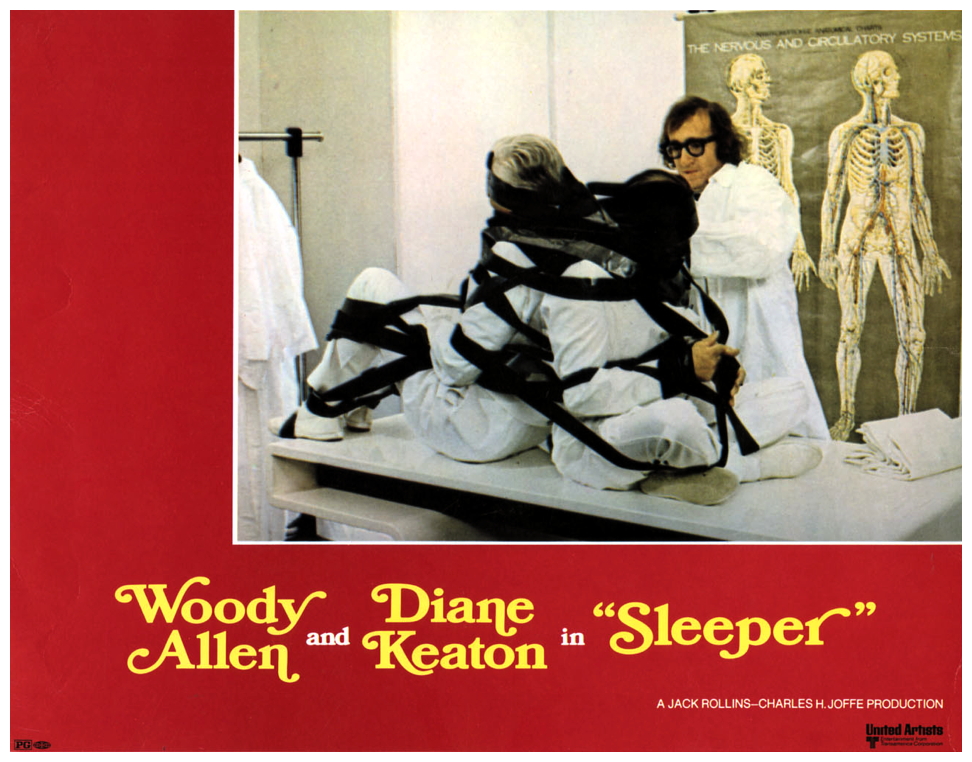 “Health food store owner and wannabe jazz clarinetist Miles Monroe is involuntarily cryogenically frozen in 1973 after a mishap while in minor surgery. His still frozen body is found in 2173, and unfrozen by scientists Melik and Orva. In unfreezing Miles, the doctors have committed an illegal act in what is now a totalitarian police state, where records of the past have been destroyed and the resulting history unknown. The society is filled primarily of conformists who look to the state’s ‘leader’ for guidance. The doctors, working with an underground group of revolutionaries based in what is called the Western District, ask Miles to help the revolutionaries infiltrate the state’s secret and highly important Aries project. Their rationale is that Miles does not exist in the eyes of the state and thus if captured cannot provide any information to them. In Miles’ reluctant journey to the Western District, he co-opts the initially unwilling assistance of one of the conformists, poet Luna Schlosser, in trying both to reach the Western District and avoid capture by the police. As a non-political person who believes that all leaders are self-interested, Miles, even when learning the nature of the Aries project, has the primary goals of staying alive and getting the girl, as he is starting to fall in love with Luna, who may have her own thoughts about love and life in this society.” (courtesy IMDB)