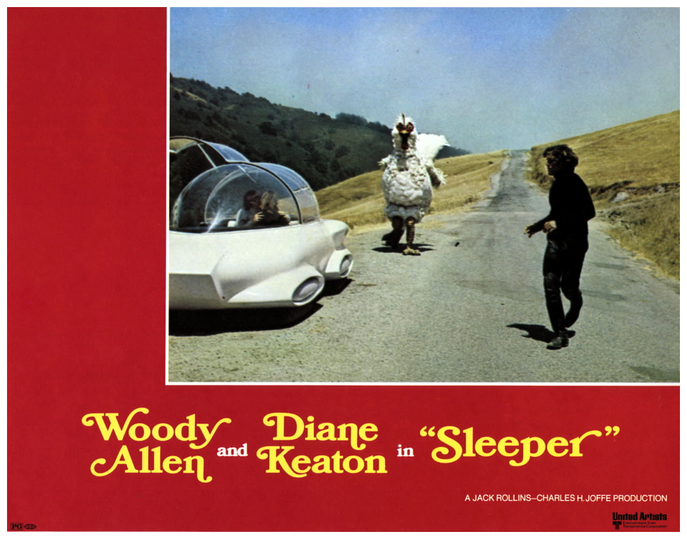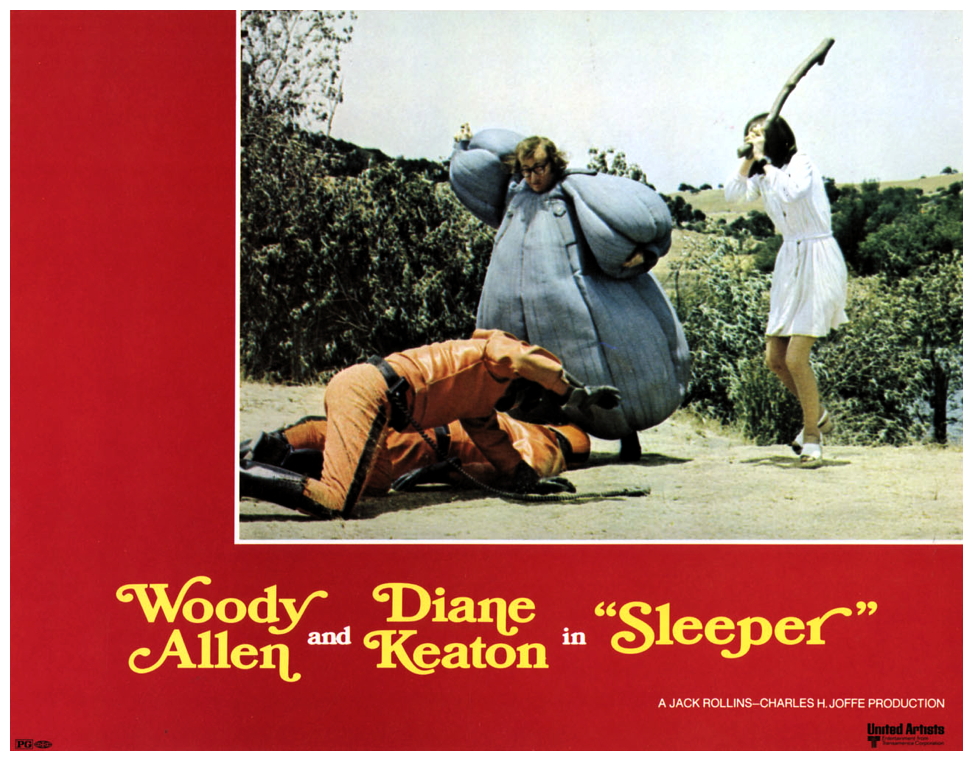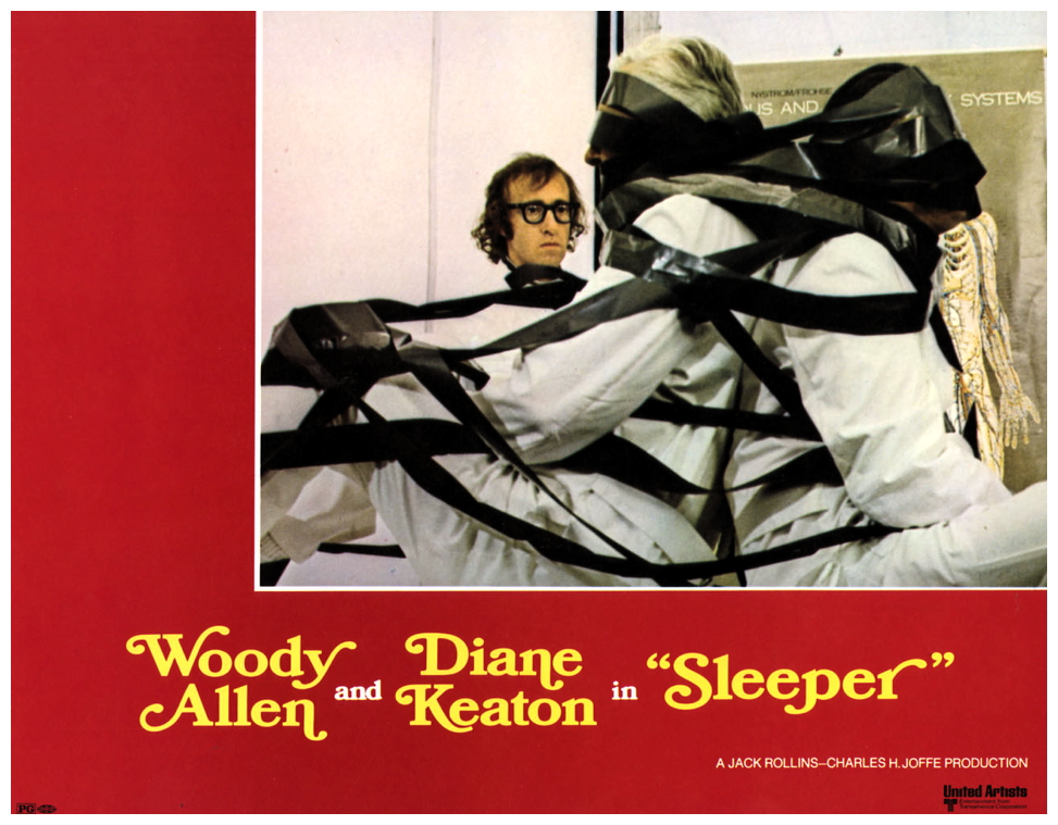 “Health food store owner and wannabe jazz clarinetist Miles Monroe is involuntarily cryogenically frozen in 1973 after a mishap while in minor surgery. His still frozen body is found in 2173, and unfrozen by scientists Melik and Orva. In unfreezing Miles, the doctors have committed an illegal act in what is now a totalitarian police state, where records of the past have been destroyed and the resulting history unknown. The society is filled primarily of conformists who look to the state’s ‘leader’ for guidance. The doctors, working with an underground group of revolutionaries based in what is called the Western District, ask Miles to help the revolutionaries infiltrate the state’s secret and highly important Aries project. Their rationale is that Miles does not exist in the eyes of the state and thus if captured cannot provide any information to them. In Miles’ reluctant journey to the Western District, he co-opts the initially unwilling assistance of one of the conformists, poet Luna Schlosser, in trying both to reach the Western District and avoid capture by the police. As a non-political person who believes that all leaders are self-interested, Miles, even when learning the nature of the Aries project, has the primary goals of staying alive and getting the girl, as he is starting to fall in love with Luna, who may have her own thoughts about love and life in this society.” (courtesy IMDB)
