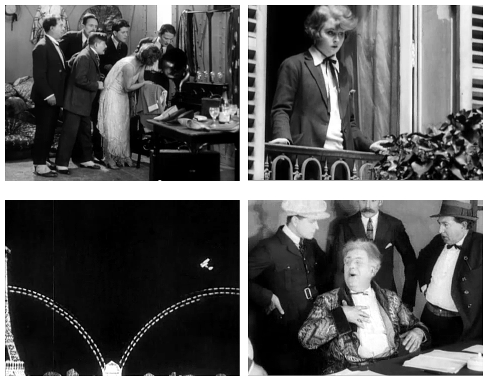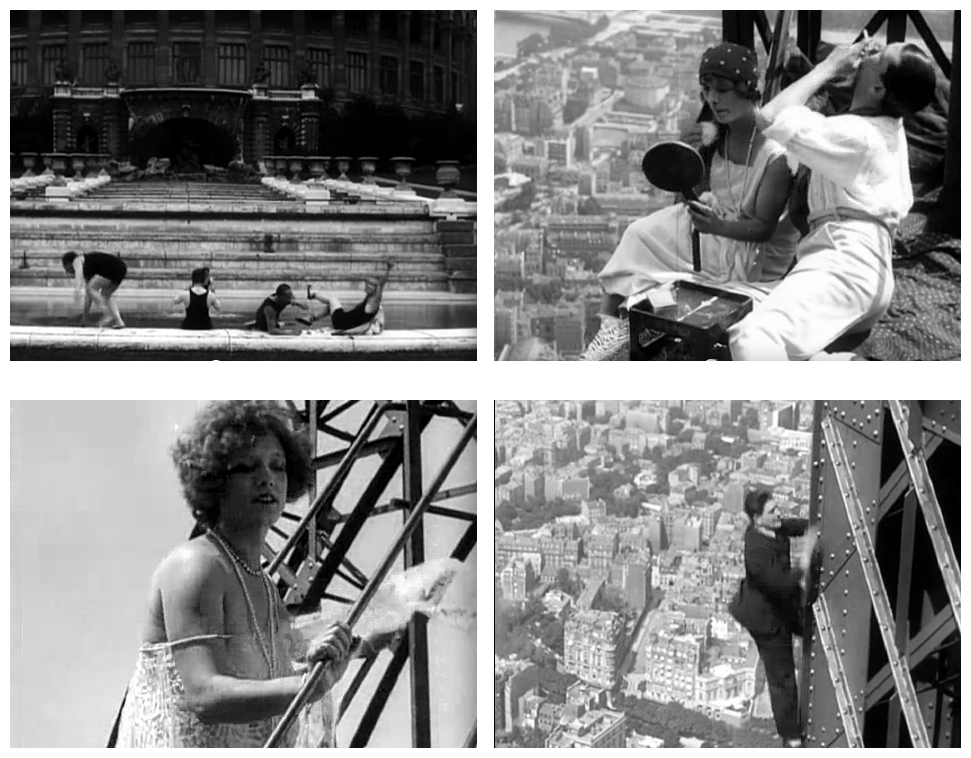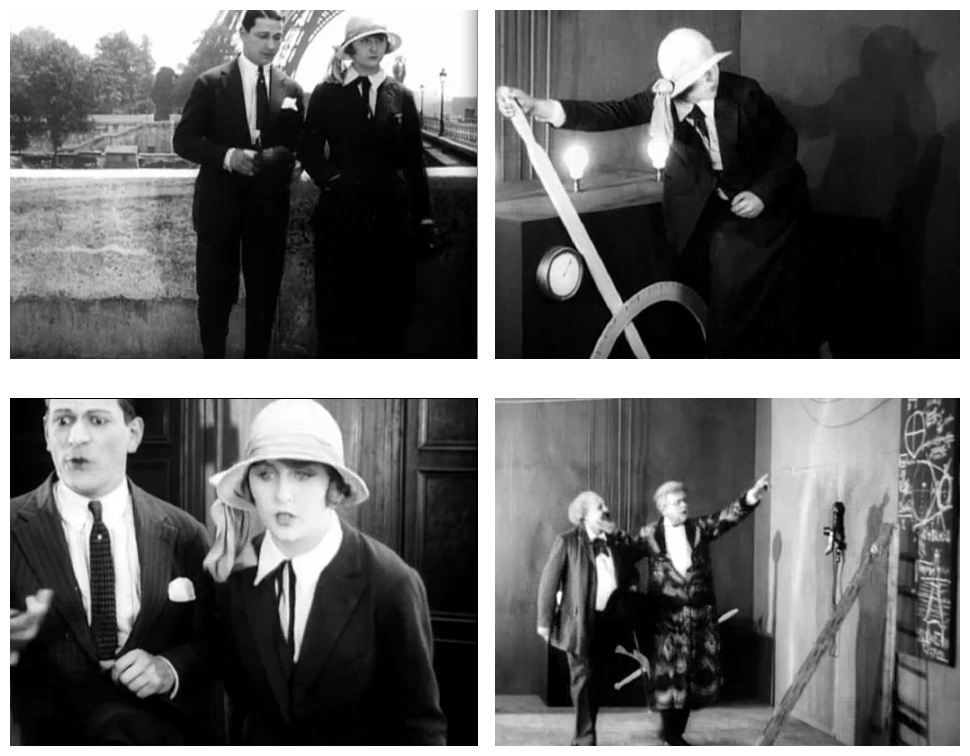 Whatever the source, Paris Asleep is no doubt best described as a comic fantasy revolving around a ‘survivors-in-a-lifeless-environment’ situation, subsequently developed and diversified by the post-apocalyptic sub-genre. More important perhaps, the film is an ode – not so much to Paris as a showcase for technological innovation – automobiles, aviation and, above all, the Eiffel Tower as a formidable beacon of progress – as to a modernity born in, and with, the invention of cinema. Not only are the two founding ends of the cinematic spectrum here reconciled – the realism of August Lumière and Louis Lumière and the magic of Méliès – but Clair implicitly pays homage to other great pioneers like Louis Feuillade and his serial films – the urban dreamlike poetry of Fantômas (1913) and Les Vampires (1915) – as well as Mack Sennett and his madcap comedies with their zany chases and slapstick fist-fights. The complete 35-minute film can be viewed at http://www.youtube.com/watch?v=Wcakn-Ruz7g