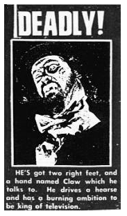 Ralph Baker played the role of Deadly Earnest in true Gothic style on ATV-0. Taking on the role after moving to Channel 0 from GTV-9, Ralph had previously worked in the props department as well as appearing in comedy sketches on the original In Melbourne Tonight with Graham Kennedy. Deadly was supported by the unforgettable characters of Claw (played by Ralph’s left hand), Igor (the devouring sound-effect), Hoof (played by Ralph’s foot) and Lily (the skeleton). The following interview was conducted in October 2009 in Ralph’s home in Chirnside, Victoria.