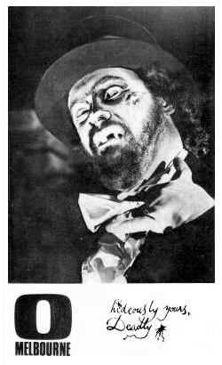 A. Yes, I did quite a lot of personal appearances. At first, it was quite by surprise – we had no idea the character was going to be so popular, and when the people starting contacting the station and saying “We’ve got something on, we’d like Deadly Earnest to make an appearance…” we had to start following them up and doing these personal appearances. I would generally get made-up and dressed at the studio, and then from there we’d drive to where ever the venue was. Well, across Melbourne, it might be an hour away before you got there, and here we were, driving through suburban streets and city streets with me in full make-up and full kit, and got some very funny looks at stoplights at times. People, as they do at stoplights, just sort of looking around, they’d suddenly see you and say “Ooh, that’s Deadly!” We got all sorts of funny reactions. One of the funniest ones that I did – fortunately it wasn’t far from the channel – and it was a football match, believe it or not, between the cast of Hair! and the Channel 10 boys – or Channel 0 boys as it was then – and I was going to make an appearance at the match. They got ahold of an old 1924 hearse and put my coffin in the back of the hearse and said “Right, well, you can hop in the car, and just before we get there we can open the back and you can get in the coffin.” Well, we found that didn’t work because as soon as you put the coffin inside the hearse there wasn’t enough room to open the lid, so the only thing I could do is hop in the coffin, then they put the coffin in the hearse, and I drove to the football match in the coffin. Not many of you could say you’ve been driven around in your own coffin, I’m sure! But we arrived there, they unloaded the coffin out of the hearse, and I popped out of the coffin – so it was something quite different.