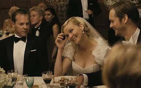 Speaking of the big picture. Melancholia really requires a close engagement into its rhythm. The film is divided per title card into 2 acts. The first centers on the sister Justine (Kirsten Dunst) who has just been married and is struggling with her decision.The 2nd half of the film is titled “Claire” (Charlotte Gainsbourg) and centers around the older sister who is married to an extremely wealthy scientist John (Kiefer Sutherland).