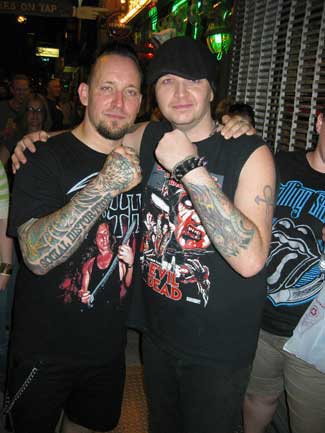 Volbeat’s new album Beyond Hell/Above Heaven will be released this month. The band’s new album which includes songs inspired by such styles including rock and roll, rockabilly, metal, thrash, country, and punk will continue the storyline from Guitar Gangsters And Cadillac Blood. I had the supreme pleasure of meeting vocalist Michael Paulsen and drummer Jon Larsen outside their show at The Trocadero in my city of Kill-adelphia not too long ago. The show itself was absolutely incredible with every song performed to a t. Paulsen’s incredible vocals thundered throughout the room, causing the crowd to literally become frenzied animals! Michael and Jon could not have been nicer and thankful as well. Ya know, it must be something about Denmark. . who knows. Another extra special treat for me was the fact that Jon was also a true grit balls to bone horror fan, with a Leatherface T-shirt to prove his devotion to the genre. What a bunch of kick ass, extraordinary gentleman! See Volbeat before they head back home for their European tour, and be sure to pick up their album from Mascot Records on September 10th. Check web site for remaining U. S. tour dates and to purchase the new disc.