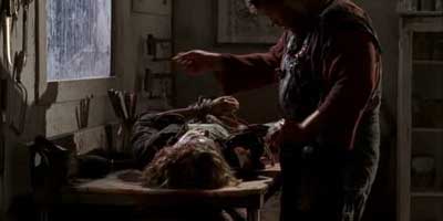 Trish goes up to the farmhouse, and asks Louise if she may use the bathroom. Louise directs her to bathroom in the little house behind the barn, which is a path to her demise. While Trish explores the little house, she is disgusted by various tools for animal slaughter in a dark, dirty room. She quickly finds out that these tools are not just for animals, as Buddy comes in and systematically slices up Trish into specific pieces needed for the body organ selling process. The rest of the group comes back to the farmhouse and splits up once more.
