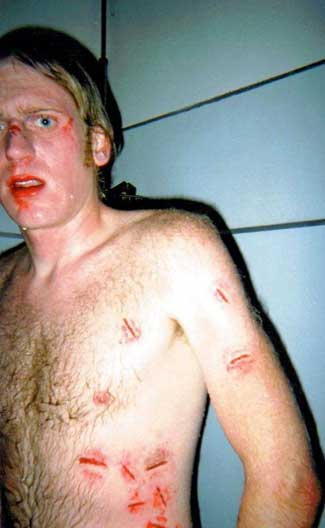 There is no humor in that…. its just plain hardcore. More of this kind of stuff follows though. While I still couldn’t put together a storyline, the acts of violence are executed one after the other. In a sequential format we begin with the 2 main characters Johnny Hawthorne and Extreme Eric filming a p*rno. In fact for the first 10 minutes, I thought maybe that’s what I was watching. The setup ends with Extreme Eric feeding a piss tube to the young p*rn volunteer which is just so wrong on many level. The angry dad pops in and starts hacking everyone to bits. Go figure..