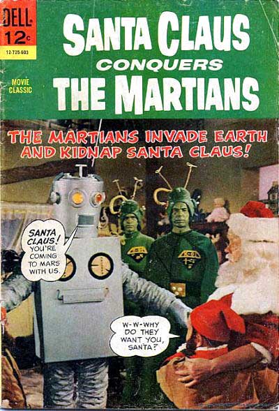 The more astute of you may have realised by now the Martians are devoid of their usual weaponry: Tripods, death rays, etc. They must have all been in the shop when they kidnapped Santa. In fact, as Martians go, they’re sort of puny and whiny, not so much warriors as bureaucrats, really. That’s why they’ve held off invading Earth, they know they’d be in awash of liability claims. And we can see some not-so-subtle propaganda here. The socialistic Martians have lost the ability to have fun, so they need Santa to show them a good time, like the capitalist whore he is.