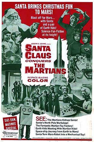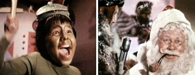 “Martians, upset that their children have become obsessed with television shows from Earth which promote the virtues of Santa Claus, start an expedition to Earth to kidnap the one and only Santa. While on Earth, they kidnap two lively children that lead the group of Martians to the North Pole and Santa. The Martians then take Santa and the two children back to Mars with them. Voldar, a particularly grumpy Martian, attempts to do away with the children and Santa before they get to Mars, but their leader Lomas stops him. When they arrive on Mars, Santa, with the help of the two Earth children and a rather simple-minded Martian lackey, overcomes the Martians by bringing fun, happiness and Christmas cheer to the children of Mars.” (courtesy IMDB)