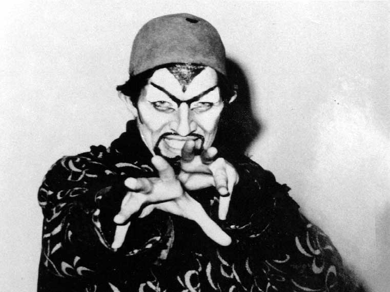 A. About a half-an-hour, or if I was running late, twenty minutes. The droopy eye was actually an optical illusion. If I remember correctly, I blacked out most of around the right eye, and whited out the top of that eye, and most of the time kept a slightly c**ked eyebrow there, so the visual contrast with it blacked out here, and the white around that one made this eye look like it was drooping. When it first started I always had a scar, a scar across that cheek I think – I can’t remember now. But the first time we did it and for some of the stills we used an old nineteenth century recipe for making scars, which was using egg white and the inside skin of an egg. Use the egg white to stick the strip of the inside skin on, and as it dried it pulled the skin up in a scar. The trouble was, as soon as you spoke the whole thing cracked, and disappeared. So it was great for stills, but not much good for, you know, leaping around the set. We would have enhanced that with a bit of make-up.