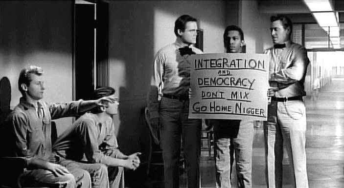 The first, Stuart (James Best), believes he’s a Confederate General still fighting the civil war. The second, Boden (Gene Evans), is a former atomic scientist who now has the mentality of a small child. The third is Trent (Hari Rhodes), who was once the only Negro student at a Southern University. Furthermore, his primary hobby is collecting pillowcases and seems to believe he co-founded the Ku Klux Klan. At one stage Trent even attempts to lynch a fellow Afro-American (“Get him before he tries to marry my daughter!”) and, in a preceding scene, marches down the corridor carrying a protest sign that reads ‘Integration And Democracy Don’t Mix. Go Home, Nigger’. Just about as confronting, bold and offensive as Fuller has ever been, and what’s more, it’s grammatically correct!